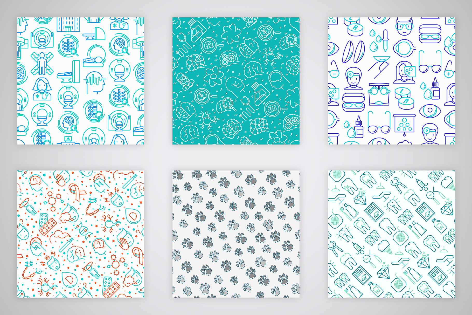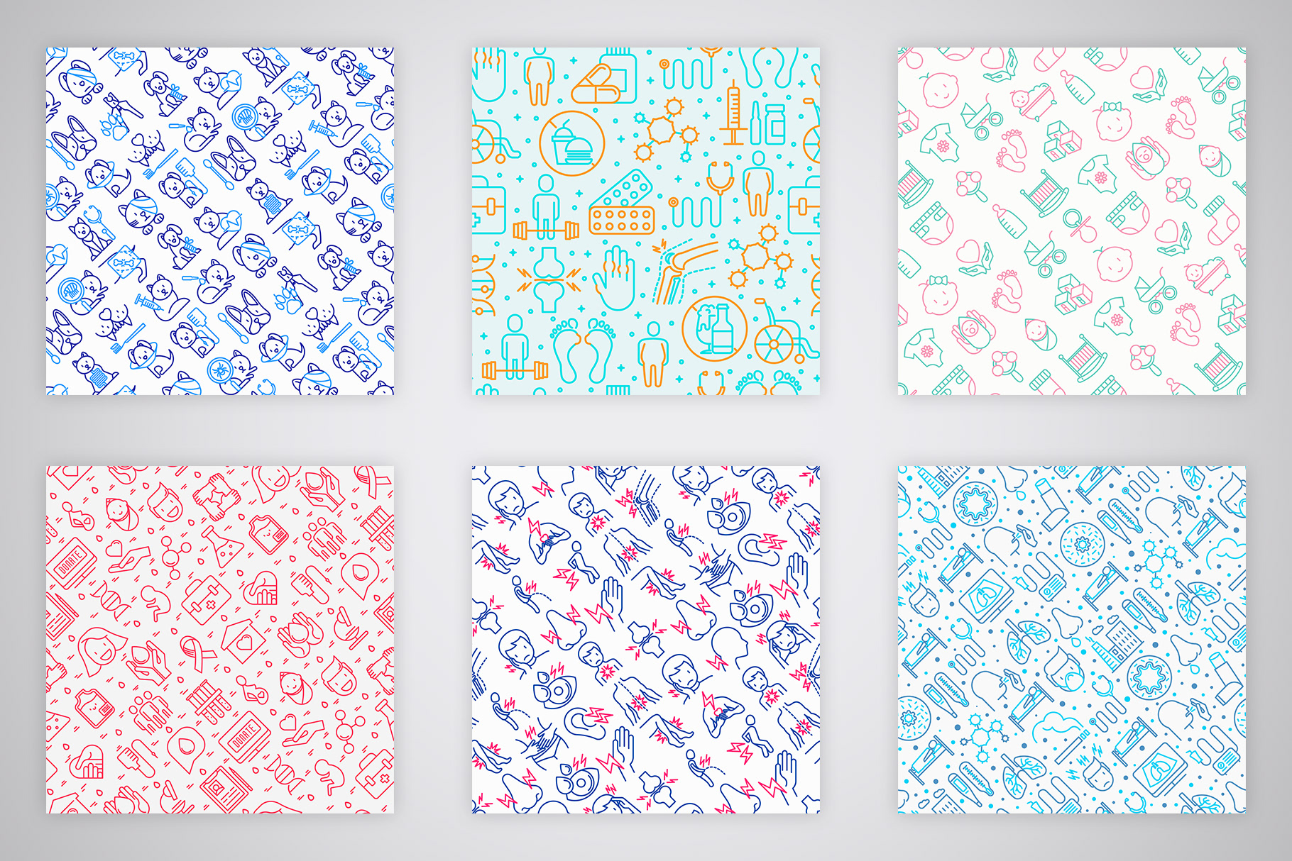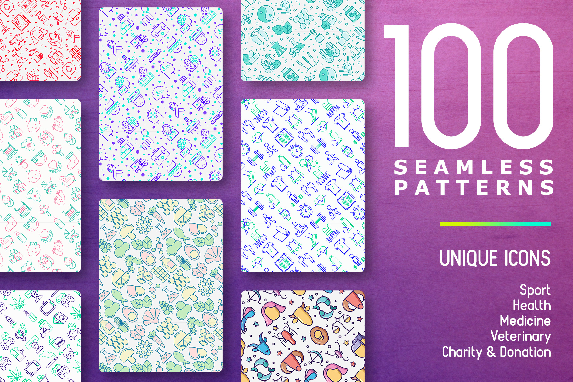 100 Seamless Patterns | Thin Line Icons Subjects and directions: Alternative Medicine, Arthritis, Asthma And Allergy, Baby Care, Bad Habits, Blood Donation, Body Ache, Bronchitis, Cardiology, Charity, Dentist, Diabetes, Epilepsy, Fitness, Flu, Food Intolerance, Football, Gut Flora, Healthy food, Heart Attack, Herbal Therapy, Hospital, Human Organs, Human Thinking, Hygiene, Influenza, Medicine, Mind Process, MRI diagnostic, Neurology, Ophthalmologist, Orthopedist, Pets and veterinary, Physiotherapy, Psychologist, Sclerosis, Seafood, Sleep insomnia, Sports Equipment, Tuberculosis, Vaccination, Wedding, Zodiac