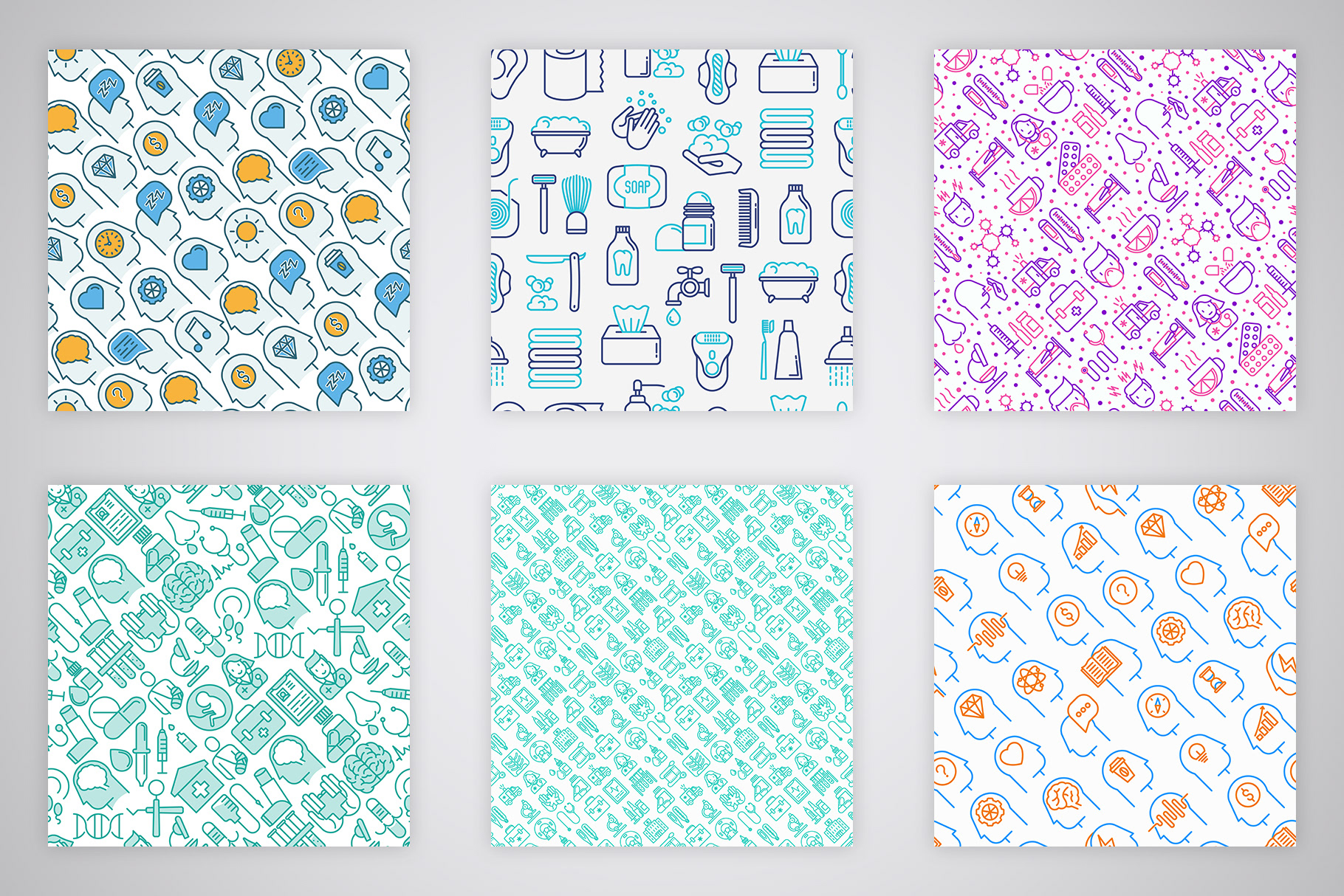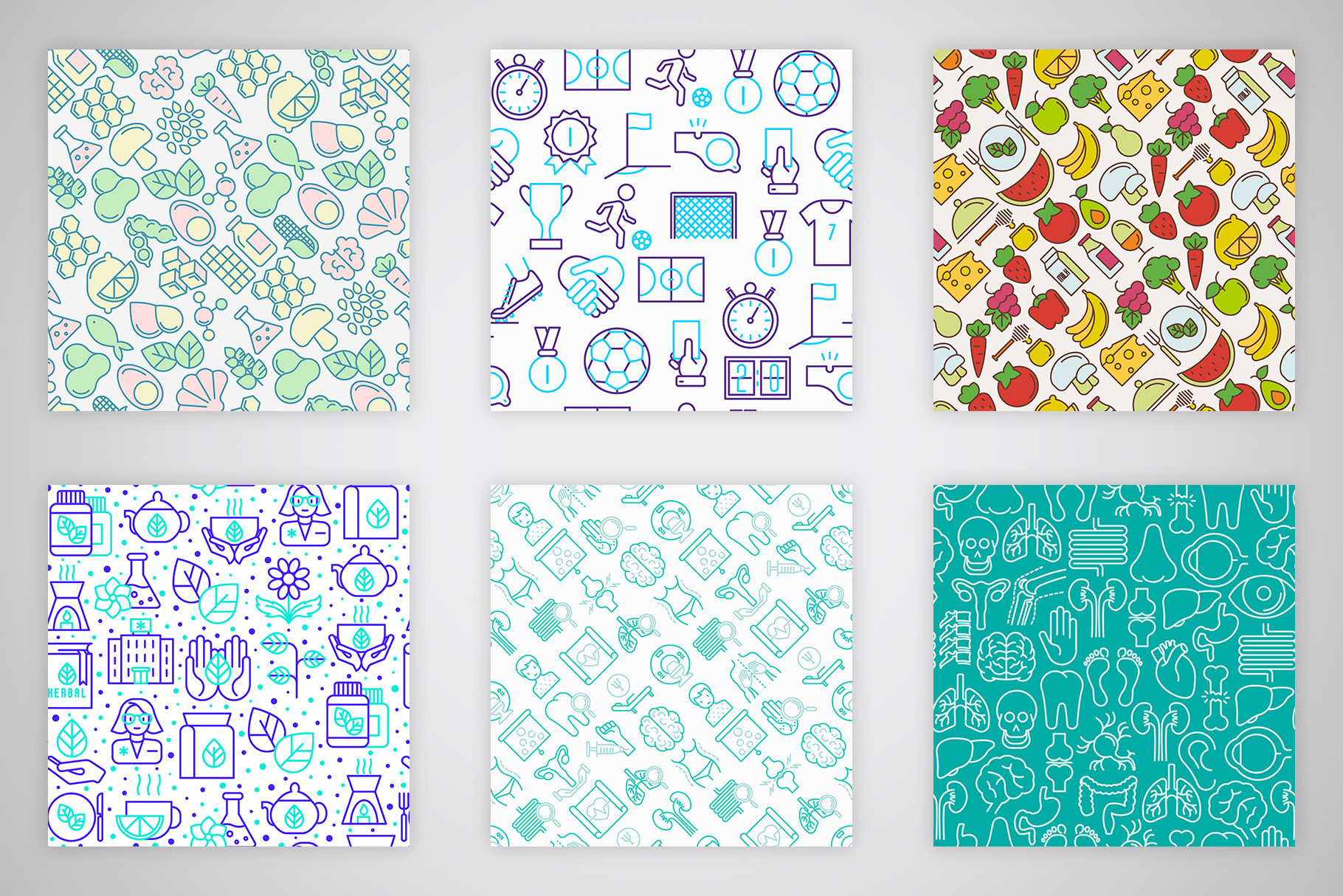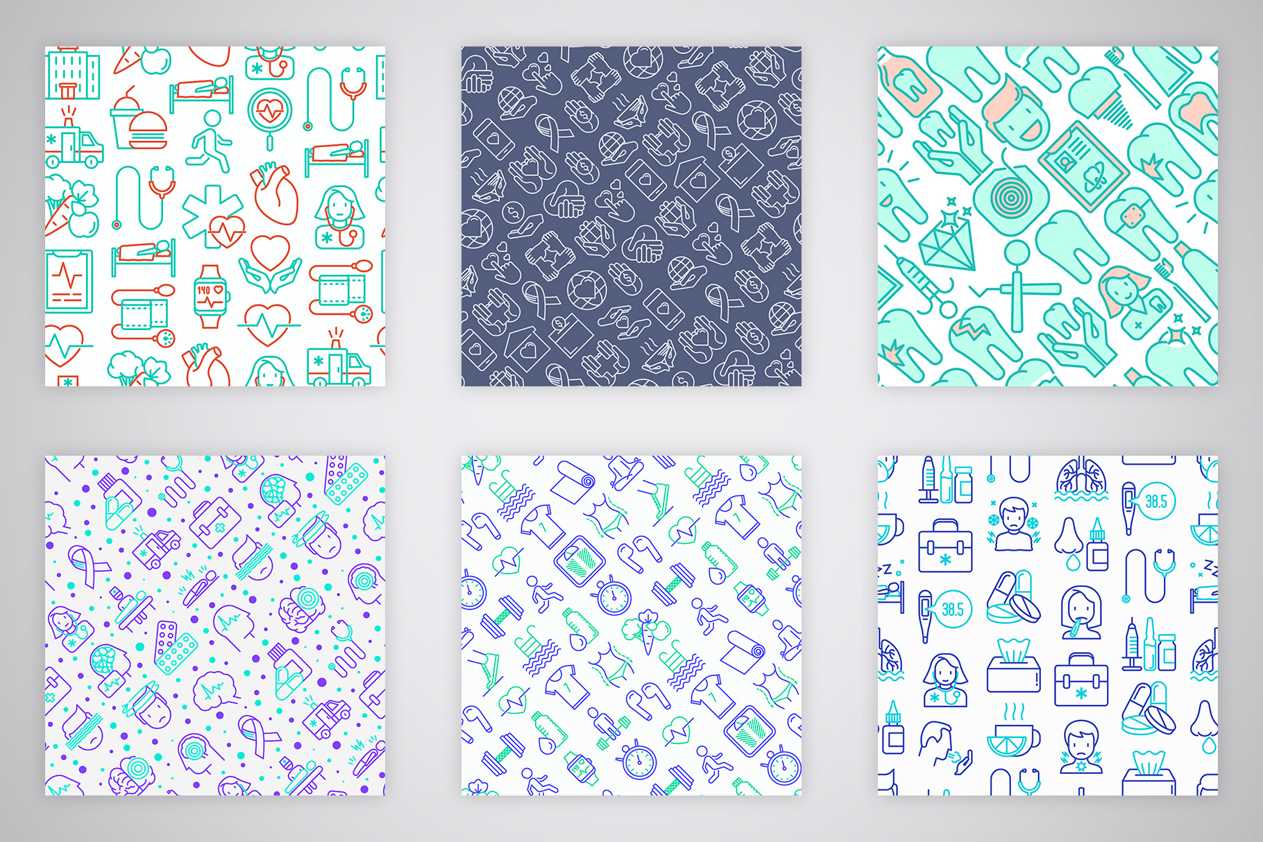 100 Seamless Patterns | Thin Line Icons Subjects and directions: Alternative Medicine, Arthritis, Asthma And Allergy, Baby Care, Bad Habits, Blood Donation, Body Ache, Bronchitis, Cardiology, Charity, Dentist, Diabetes, Epilepsy, Fitness, Flu, Food Intolerance, Football, Gut Flora, Healthy food, Heart Attack, Herbal Therapy, Hospital, Human Organs, Human Thinking, Hygiene, Influenza, Medicine, Mind Process, MRI diagnostic, Neurology, Ophthalmologist, Orthopedist, Pets and veterinary, Physiotherapy, Psychologist, Sclerosis, Seafood, Sleep insomnia, Sports Equipment, Tuberculosis, Vaccination, Wedding, Zodiac