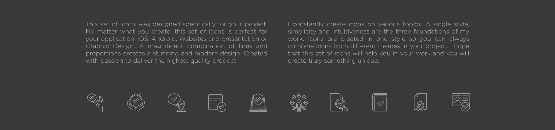 This set of icons was designed specifically for your project. No matter what you create, this set of icons is perfect for your application, iOS, Android, Websites and presentation or Graphic Design. A magnificent combination of lines and proportions creates a stunning and modern design. Created with passion to deliver the highest quality product. I constantly create icons on various topics. There are already several thousand icons in my collection. A single style, simplicity and intuitiveness are the three foundations of my work. Icons are created in one style so you can always combine icons from different themes in your project. I hope that this set of icons will help you in your work and you will create truly something unique. Icons are aligned to the pixel grid ensuring consistent quality at all times.
